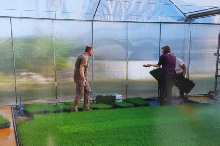 Wenn der Ballen gut durchwurzelt ist, werden die kleinen Pflänzchen in größere Platten pikiert, in die je 54 Pflanzen passen. Diese Platten werden dann in Freiland oder in Folienzelte gestellt. Über den Winter werden sie zum Teil mit Flies abgedeckt damit sie vor Frost geschützt sind.